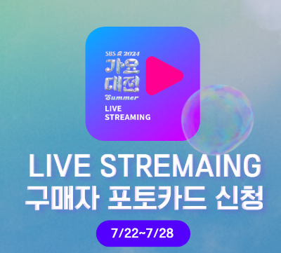 올해의 SBS 가요대전 Summer는 일요일 황금 시간대에 진행되었기 때문에 생방송으로 SBS 채널에서 방영되지는 않았으며, 라이브 방송은 온라인에서 유료로 생중계되었다. 이 라이브 스트리밍을 구매한 사람들을 대상으로 포토카드 신청을 받고 있으니, 혹시 잊고 신청하지 못하신 분들은 포토카드 신청을 잊지 마시길. (여자)아이들 랜덤포토카드라고 하는데, 배송비는 본인부담이다. 미신청시 발송되지 않으니, 신청하실 분은 아래 사진을 클릭해서 7.22~7.28까지 늦기 전에 신청하시길 바란다.