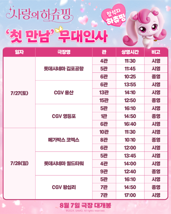 각 극장에서 사랑의 하츄핑을 검색해보면 지금은 아직 정식 예매는 풀리지 않은 상태라서 무대인사만 조회가 가능한데, 좌석이 한자리 수 정도로 남아있다. 하츄핑이 참석한다는 것으로 봐서, 아마 대형 하츄핑 인형이 오지 싶은데, 하츄핑 좋아하는 어린이의 부모님이라면 무대인사 데려가주시길! 자녀가 엄마아빠 최고라고 따봉을 날려줄 것이다.