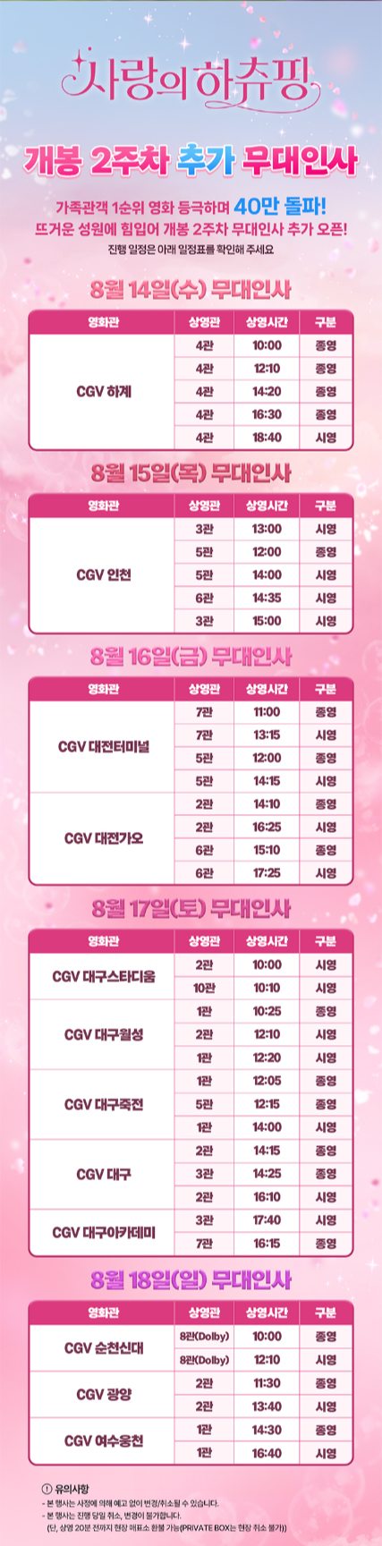 무대인사 극장 : CGV 하계, 인천, 대전터미널, 대전가오, 대구스타디움, 대구월성, 대구죽전, 대구, 대구아카데미, 순천신대, 광양, 여수웅천