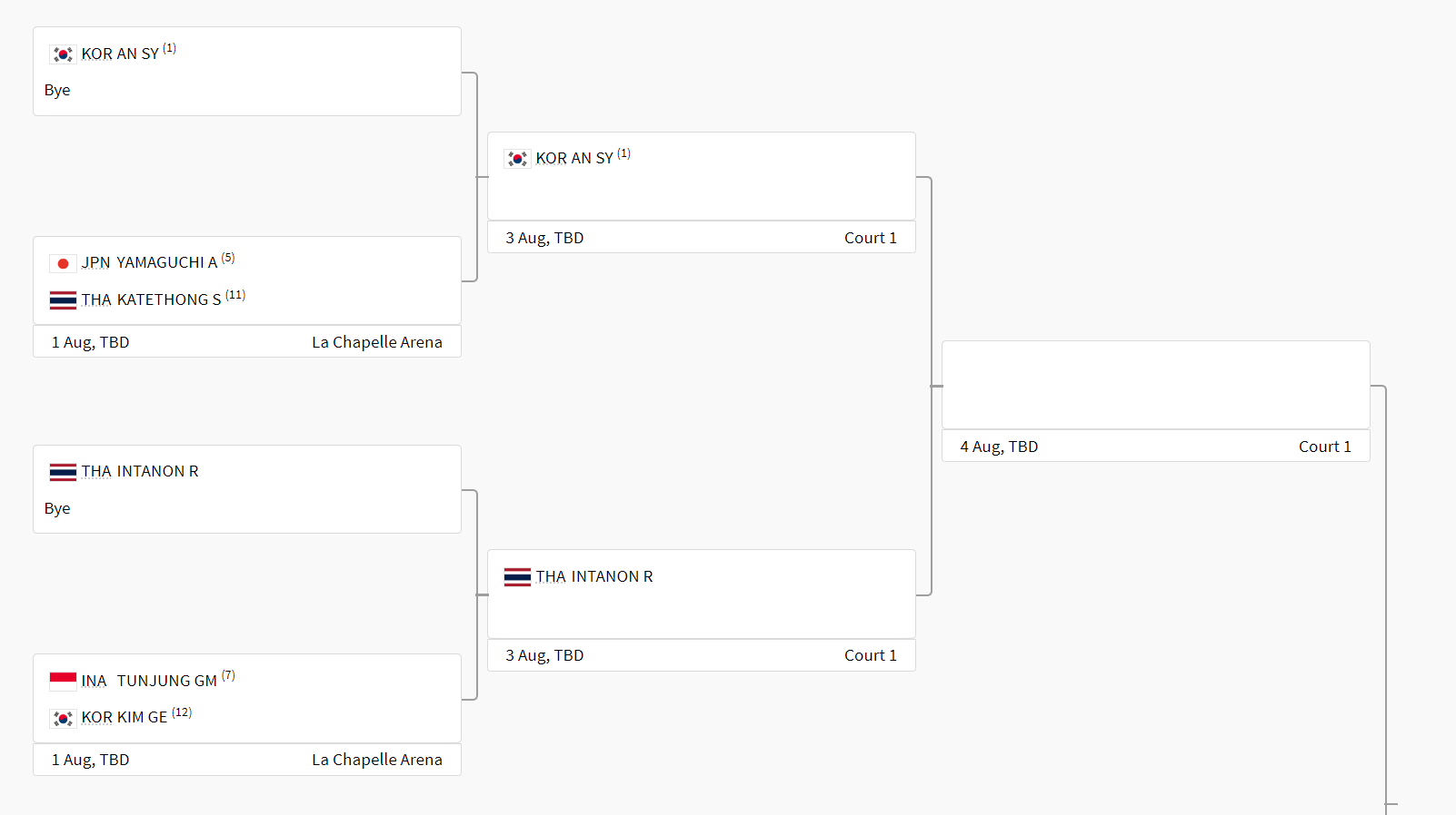 따라서 일본 선수 야마구치 아카네 VS 태국 선수 수파니다 카테통 중 승자가 8월 3일에 열릴 8강전에서 안세영 선수를 만나게 됩니다. 두 선수는 올해 1월 말레이시아 오픈에서 격돌한 적이 있는데요, 2-0(21-15, 22-20)로 야마구치 아카네가 수판디다 카테통을 이긴 바 있습니다.