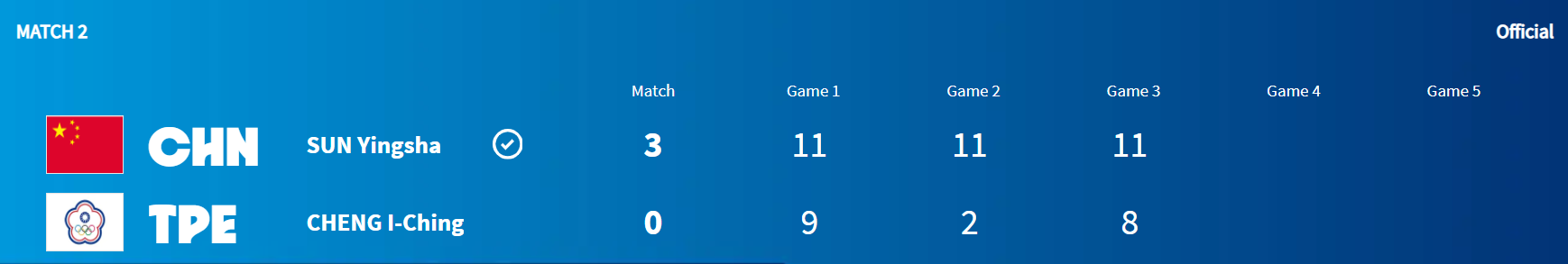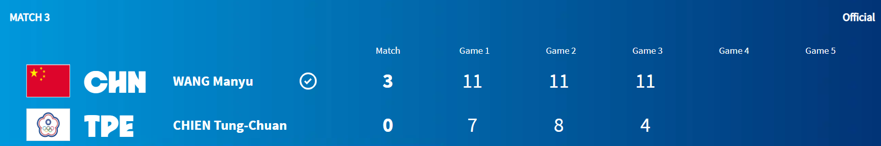 중국이 대만을 매치 스코어 3:0, 단 한게임도 내주지 않고 이겼네요.