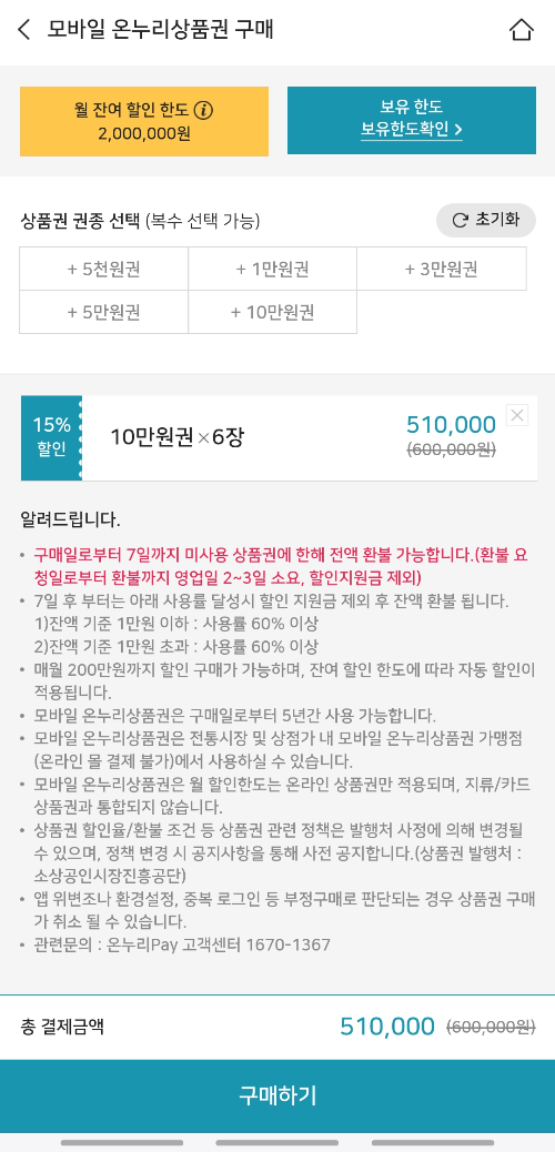 온누리상품권 유효기간은 구매일로부터 5년까지 이고, 온누리상품권 월 구매 한도가 200만원이니 구매 금액 결정시에 참고하세요!