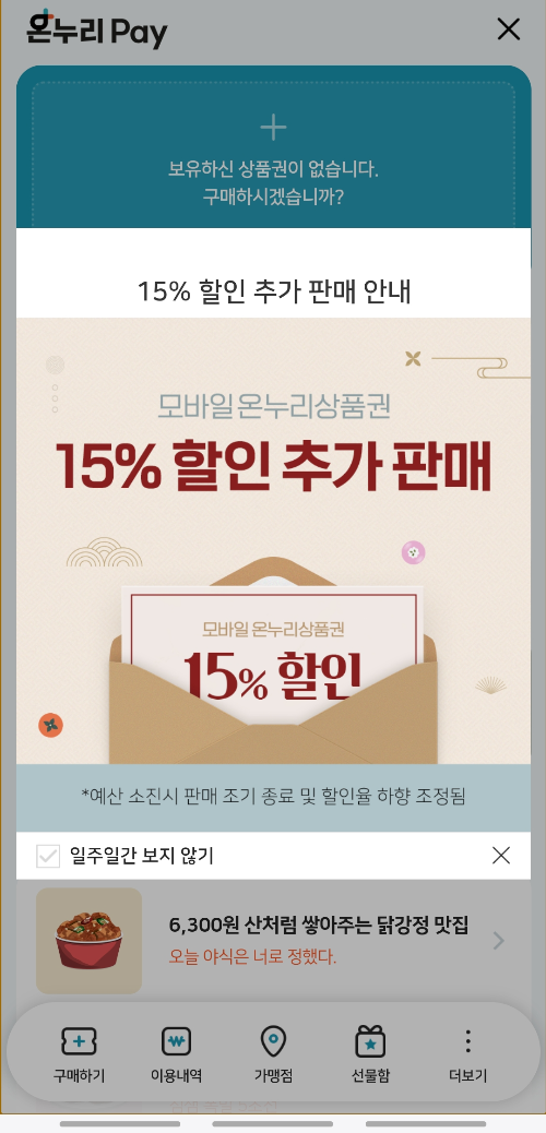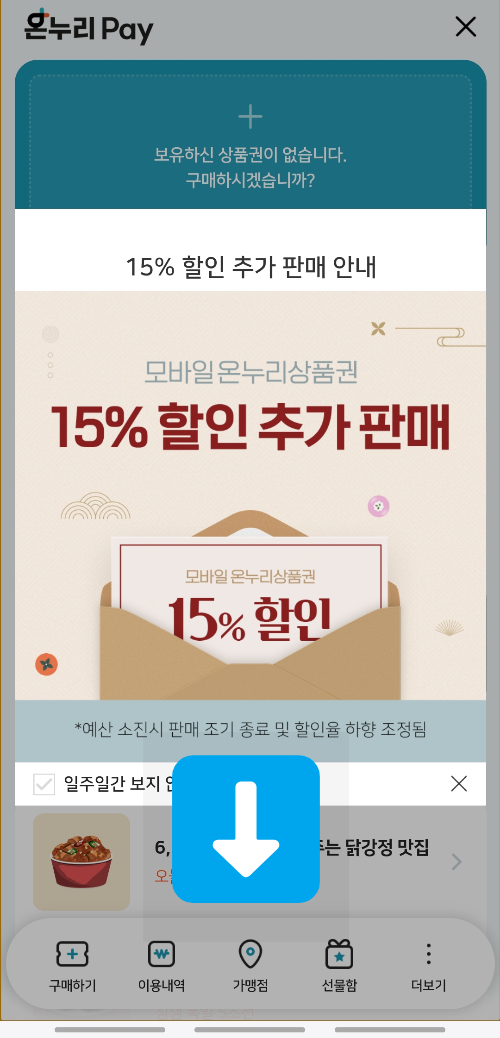 화살표로 표시된 온누리상품권 클릭하시면 다음 화면이 뜹니다. 지금 15% 할인 추가 판매 중이라고 팝업이 뜨는거 보이시죠? 예산 소진되면 판매 조기 종료래요. 이미 한번 종료 된 건데 추가로 다시 뜬거니까, 다시 또 소진 되기 전에 얼른 서두르세요!