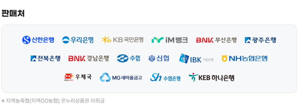 지류 온누리 상품권은 상기 은행에서 구매하실 수 있습니다. 재고 있는지 확인하고 가시는 것 잊지 마세요!