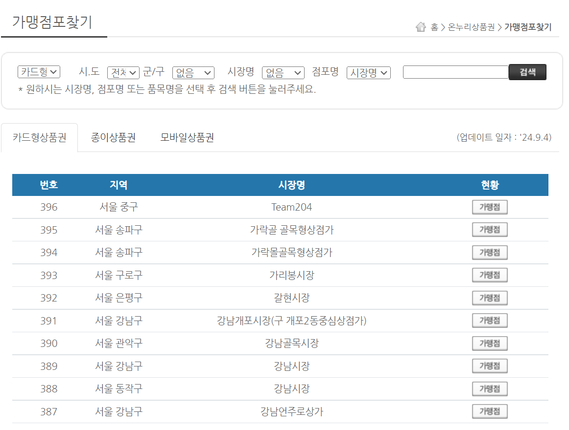 꼭 앱으로만 조회되는 것은 아니에요, 아래 버튼 클릭하시면 온누리상품권 사용처 및 가맹점을 쭉 지역별로 보실 수 있어요. 지역, 시장명, 현황을 모두 조회하실 수 있습니다. 업데이트 일자까지 나와있으니, 얼마나 온누리상품권 사용처 가맹점 정보가 언제 나온건지도 확인할 수 있지요. 공식 페이지니까 가장 최근의 정보를 확인하실 수 있을거에요.
