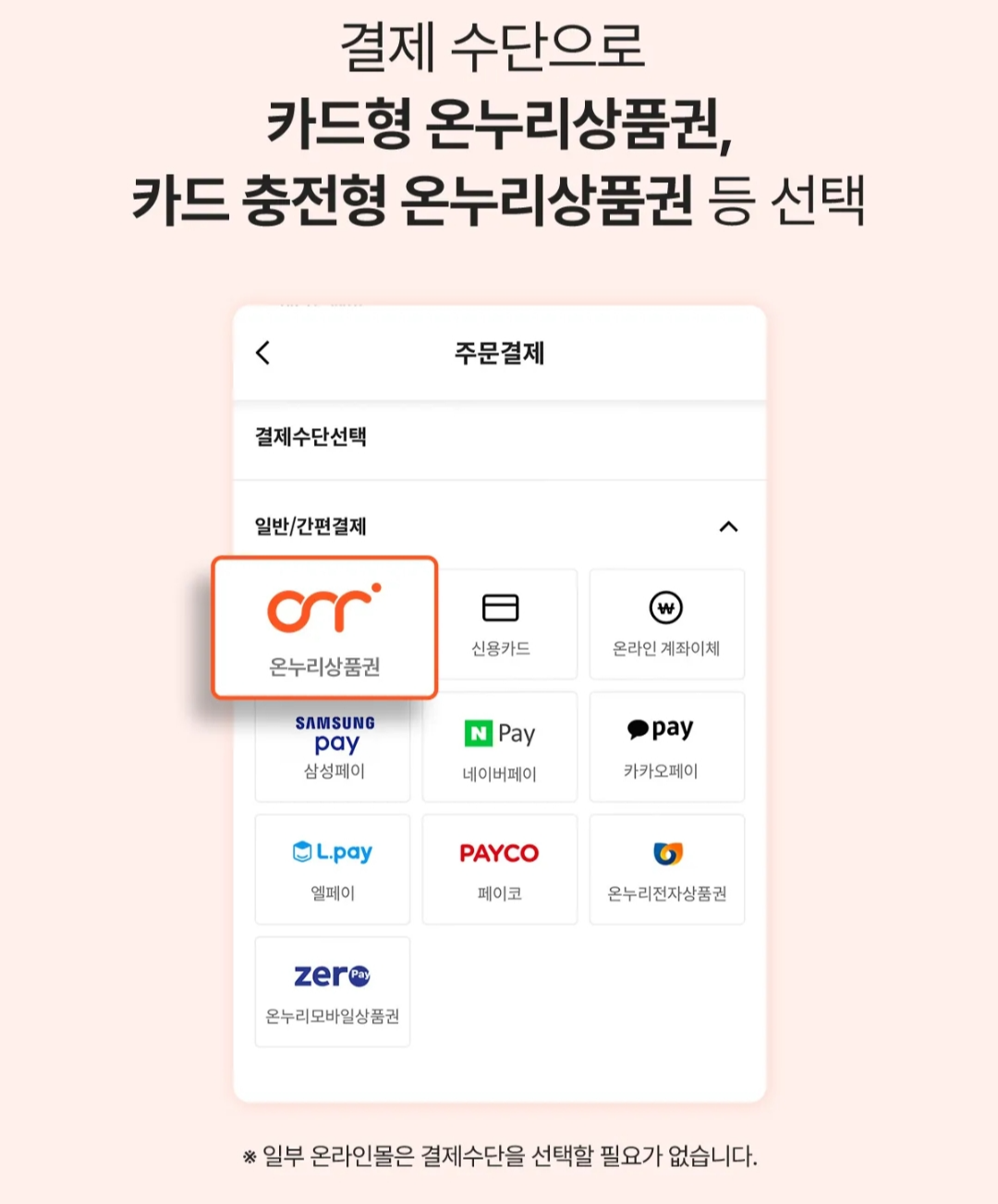 제휴 온라인 몰에서 결제수단으로 카드형 온누리상품권, 카드 충전형 온누리 상품권을 선택하세요