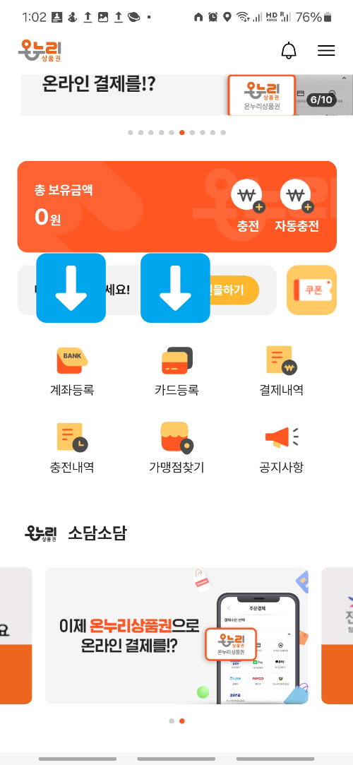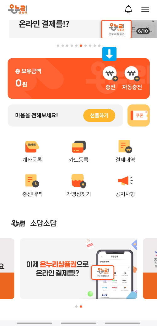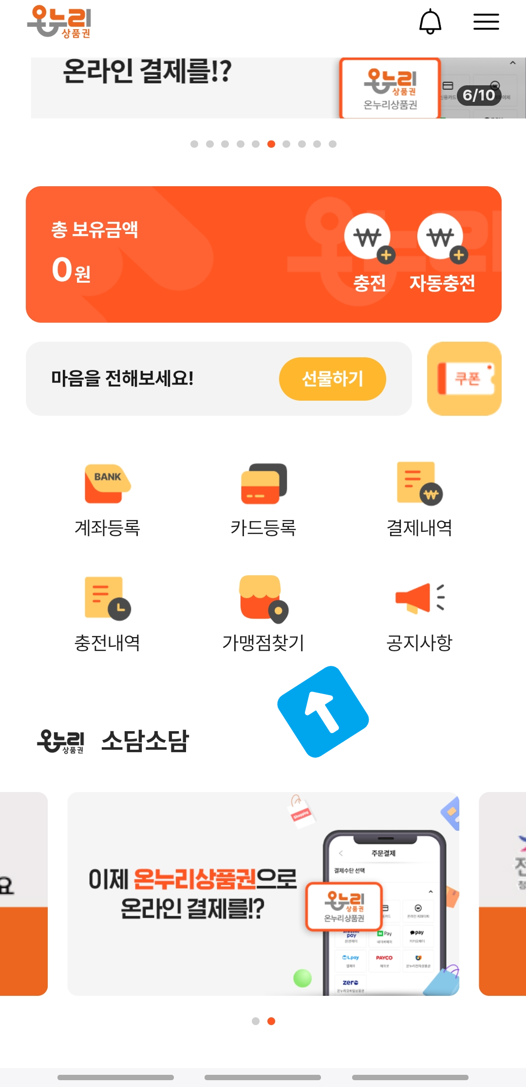 그 다음 충전한 온누리상품권을 사용하실 때 쓸 카드를 카드 등록에서 등록해주세요.