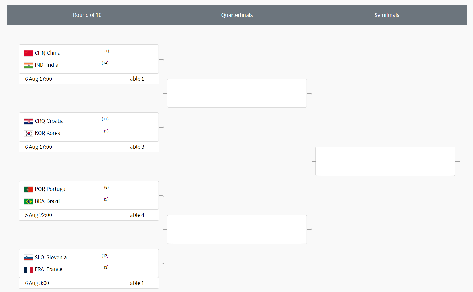 탁구 남자 단체 16강전은 8월 6일 17:00에 크로아티아를 상대로 열립니다. 우선 남자 탁구 대진표부터 한번 살펴볼까요