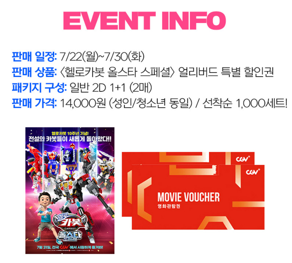7.22~7.30까지 헬로카봇 올스타 스페셜의 얼리버드 특별 할인권을 CGV에서 판매한다.